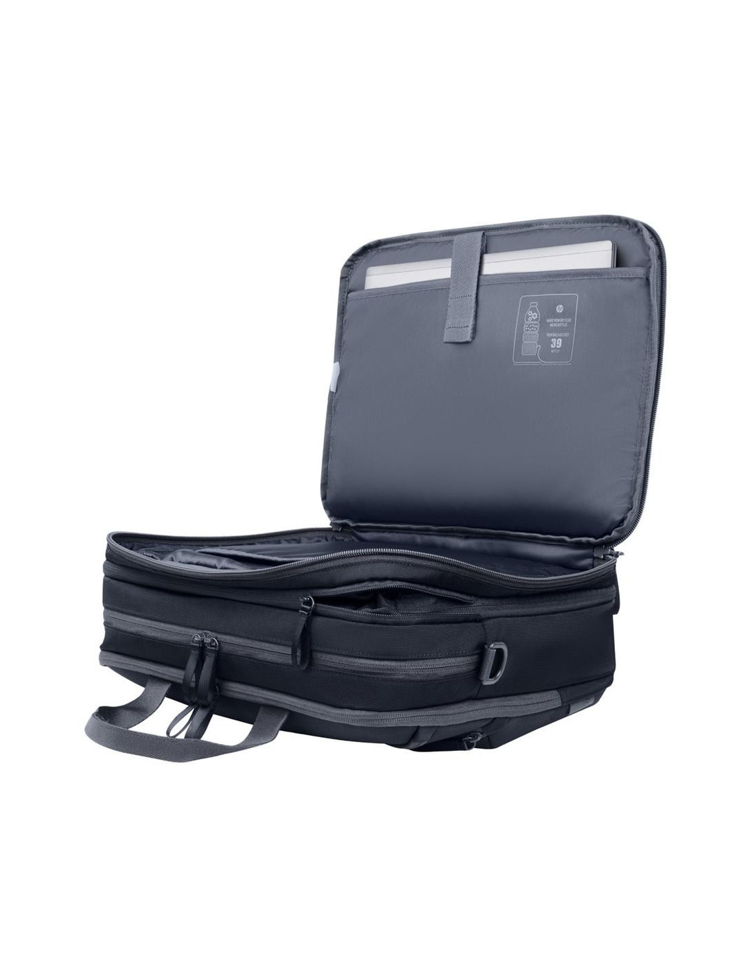 La HP TRAVEL PLUS ofrece un compartimento acolchado para portátiles de hasta 14,1 pulgadas, con espacio adicional para documentos, accesorios o cargadores. Su volumen interno de hasta 20 litros permite mantener todo organizado sin aumentar el grosor del maletín.
