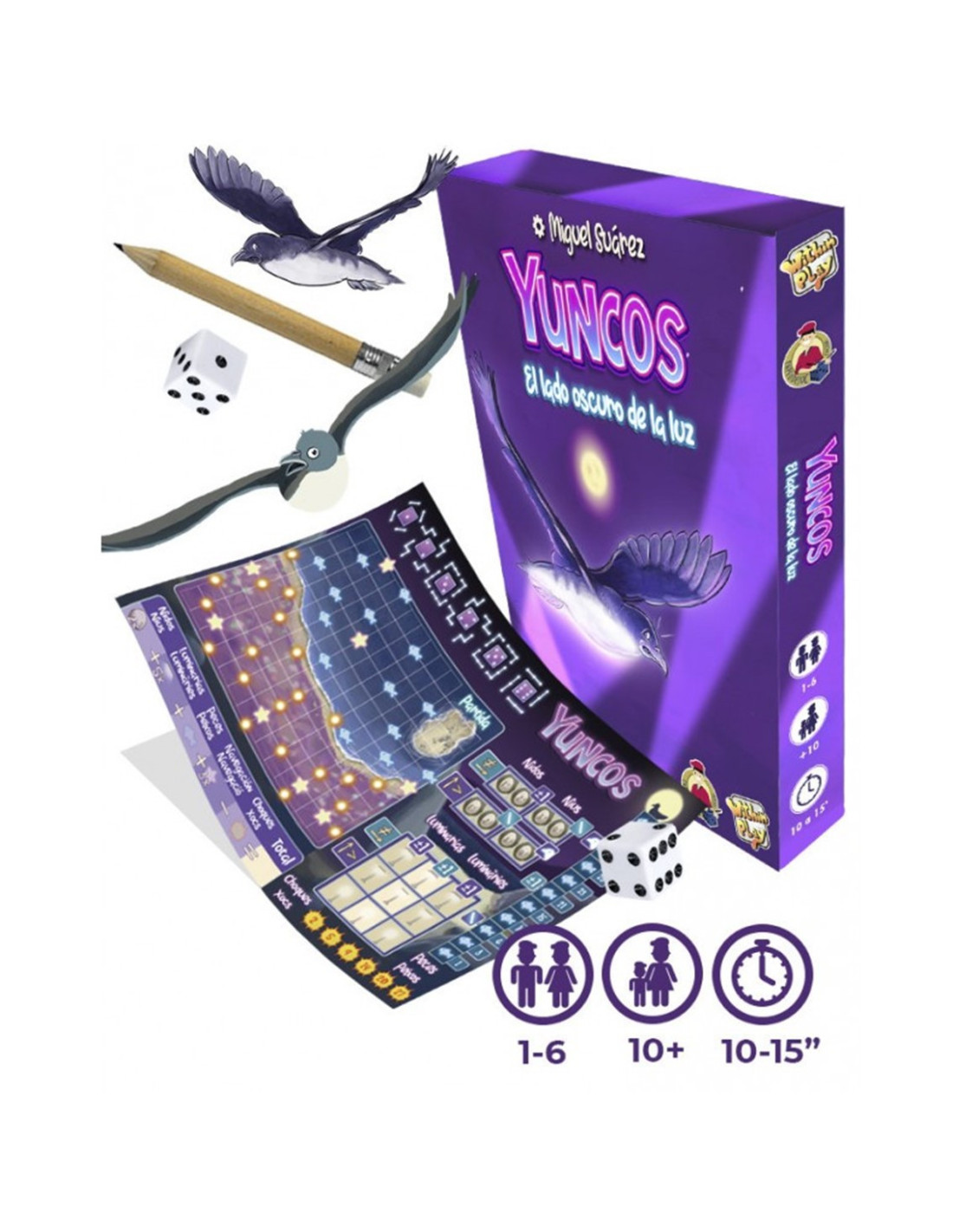 Yuncos: El lado oscuro de la luz es un juego de mesa tipo roll & write diseñado por Miguel Suárez, inspirado en la fauna de Chile y en la importancia de la preservación y protección de sus especies. Pensado para partidas rápidas y dinámicas, es ideal para disfrutar en familia o con amigos, combinando estrategia ligera y temática educativa en cada ronda.
