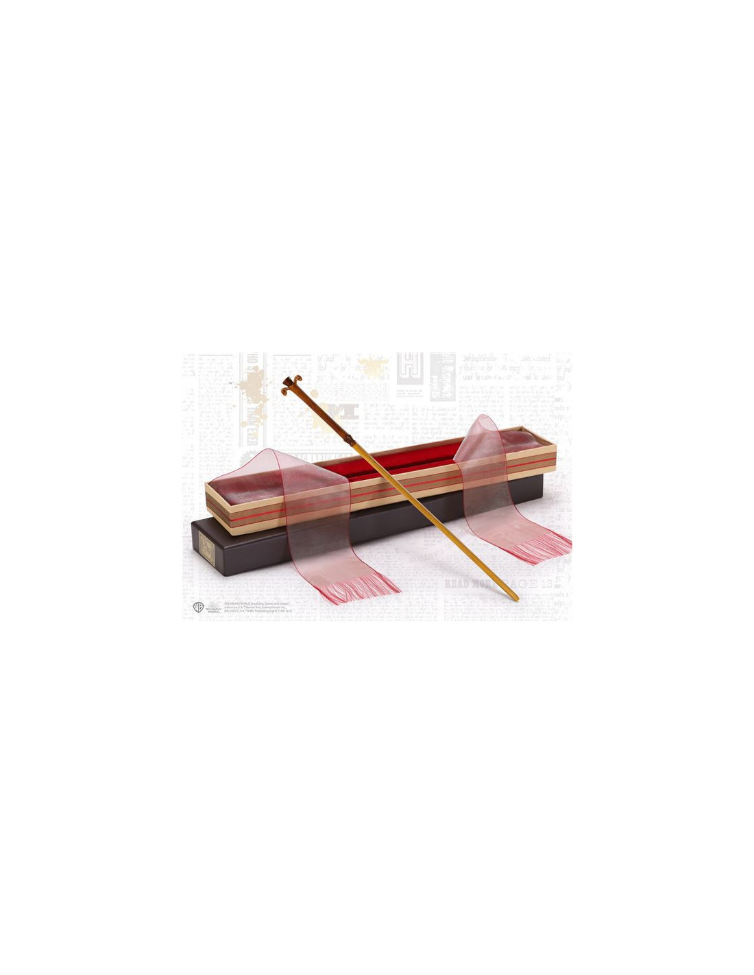 Alojada en una caja para varitas de Ollivander, el interior de terciopelo de felpa y la delicada cinta envuelven el elegante diseño de flor de lis de la varita, que es un símbolo de la magia.