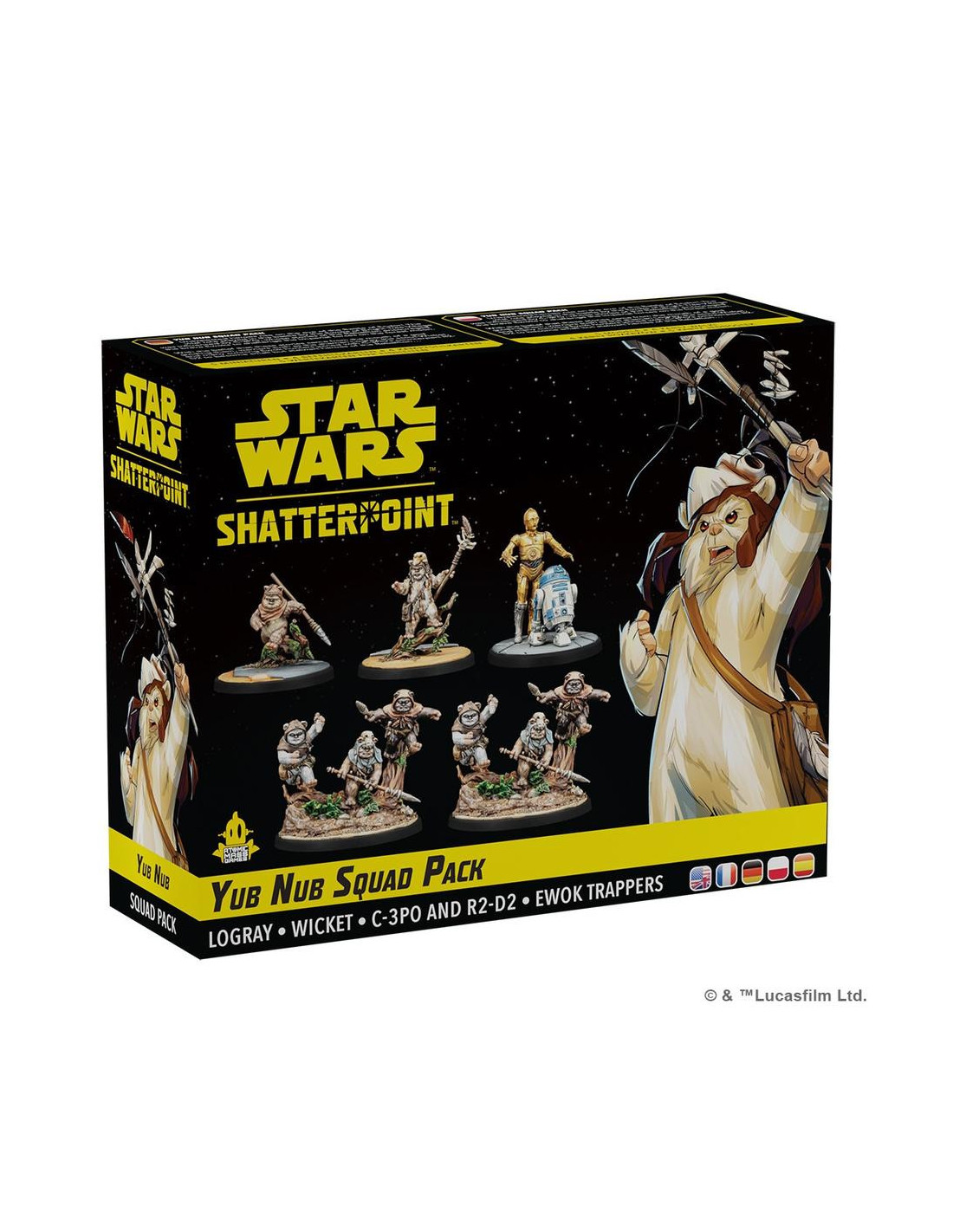El pack de escuadrón Yub Nub para Star Wars Shatterpoint trae al campo de batalla a los carismáticos ewoks, quienes, liderados por figuras como Logray y Wicket, se unen a los droides C-3PO y R2-D2 para luchar contra el Imperio en la luna boscosa de Endor. Diseñado como una expansión para jugadores de este juego de miniaturas, este set añade variedad táctica y una narrativa icónica inspirada en el Episodio VI de Star Wars. Ideal para fans de la saga y estrategas de mesa.