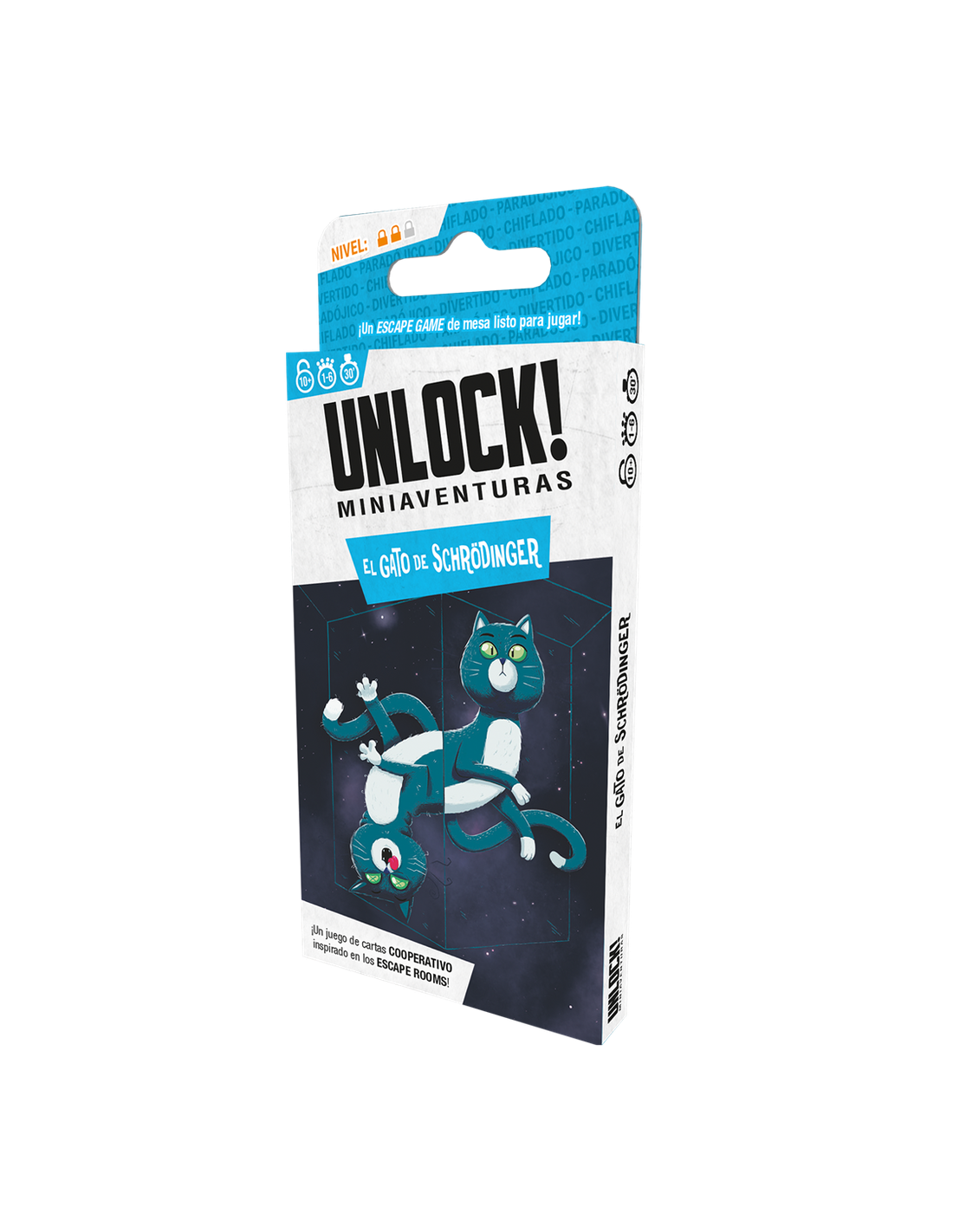 Unlock! Miniaventuras El Gato de Schrödinger es un juego de cartas cooperativo que traslada la experiencia de los escape rooms a tu propia casa, en un formato más compacto y rápido. Diseñado para partidas ágiles de 30 a 45 minutos, es ideal para disfrutar en familia o con amigos mientras exploráis un universo tan caótico como divertido en busca del misterioso gato perdido.