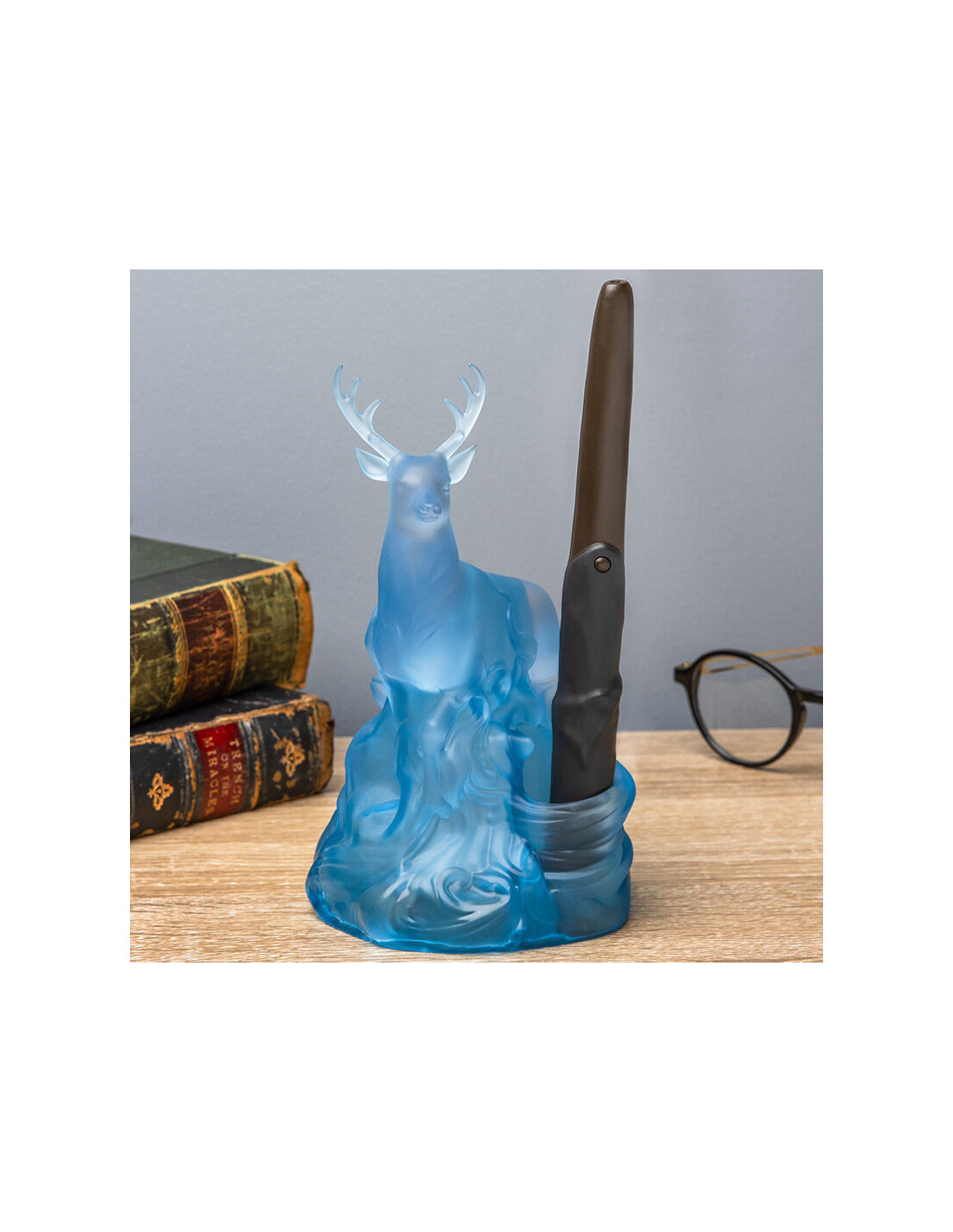 La figura del ciervo está fabricada en material translúcido que, al encenderse, emite una luz suave y etérea que imita perfectamente el aspecto de un Patronus. El diseño cuida cada detalle para ofrecer una representación fidedigna del universo de Harry Potter.