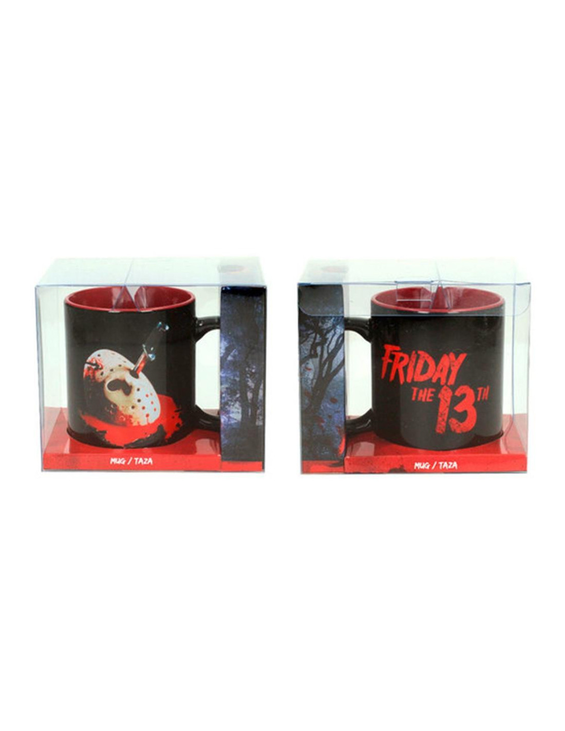 Sumérgete en el universo del cine de terror clásico con esta taza de cerámica inspirada en el póster de Viernes 13. Con un diseño impactante protagonizado por la icónica máscara de Jason Voorhees sobre un fondo sangriento, esta taza es un artículo imprescindible para fans del género y coleccionistas de productos temáticos.
