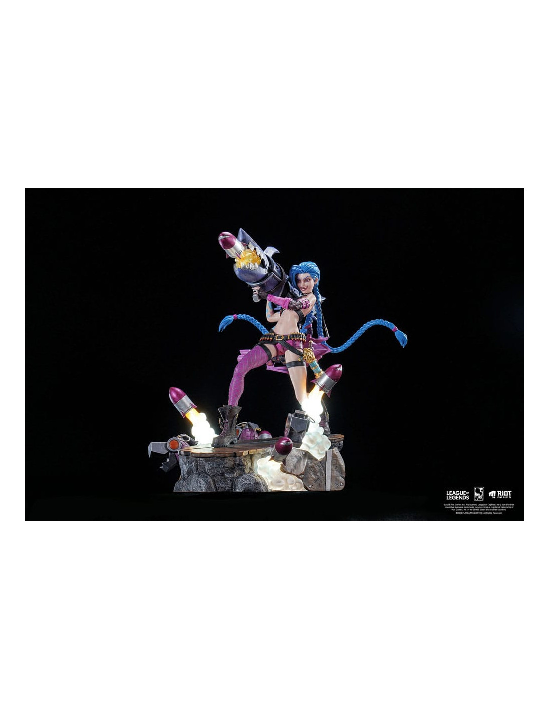 Fabricada en **poliresina de alta calidad**, esta figura de Jinx no solo destaca por su nivel de detalle, sino también por incluir una **función de luz LED** que realza su presencia, aportando un efecto visual impactante en entornos con poca iluminación. El conjunto de medidas proporciona una presencia destacada en cualquier colección.