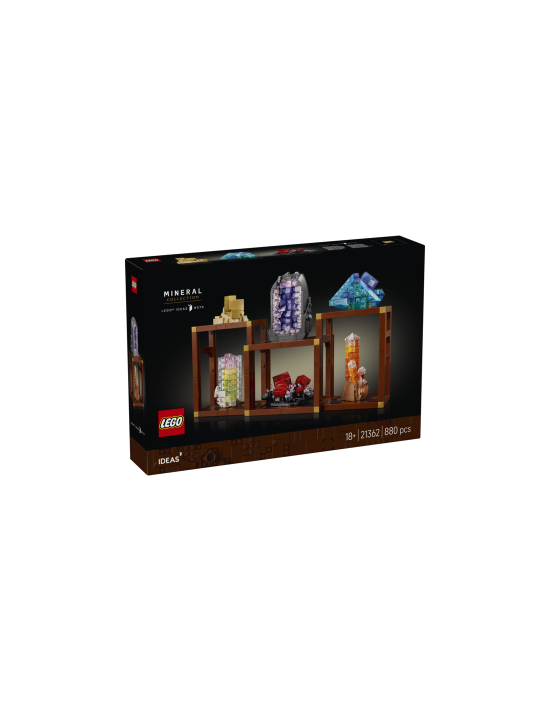 Este set está pensado para mayores de 18 años y ofrece una experiencia de construcción placentera y creativa. Con un total de 880 piezas, el montaje resulta accesible y al mismo tiempo envolvente. Las estructuras se apoyan sobre bases en forma de vitrinas que realzan su función decorativa, permitiendo exponer cada mineral individualmente o como una colección completa.