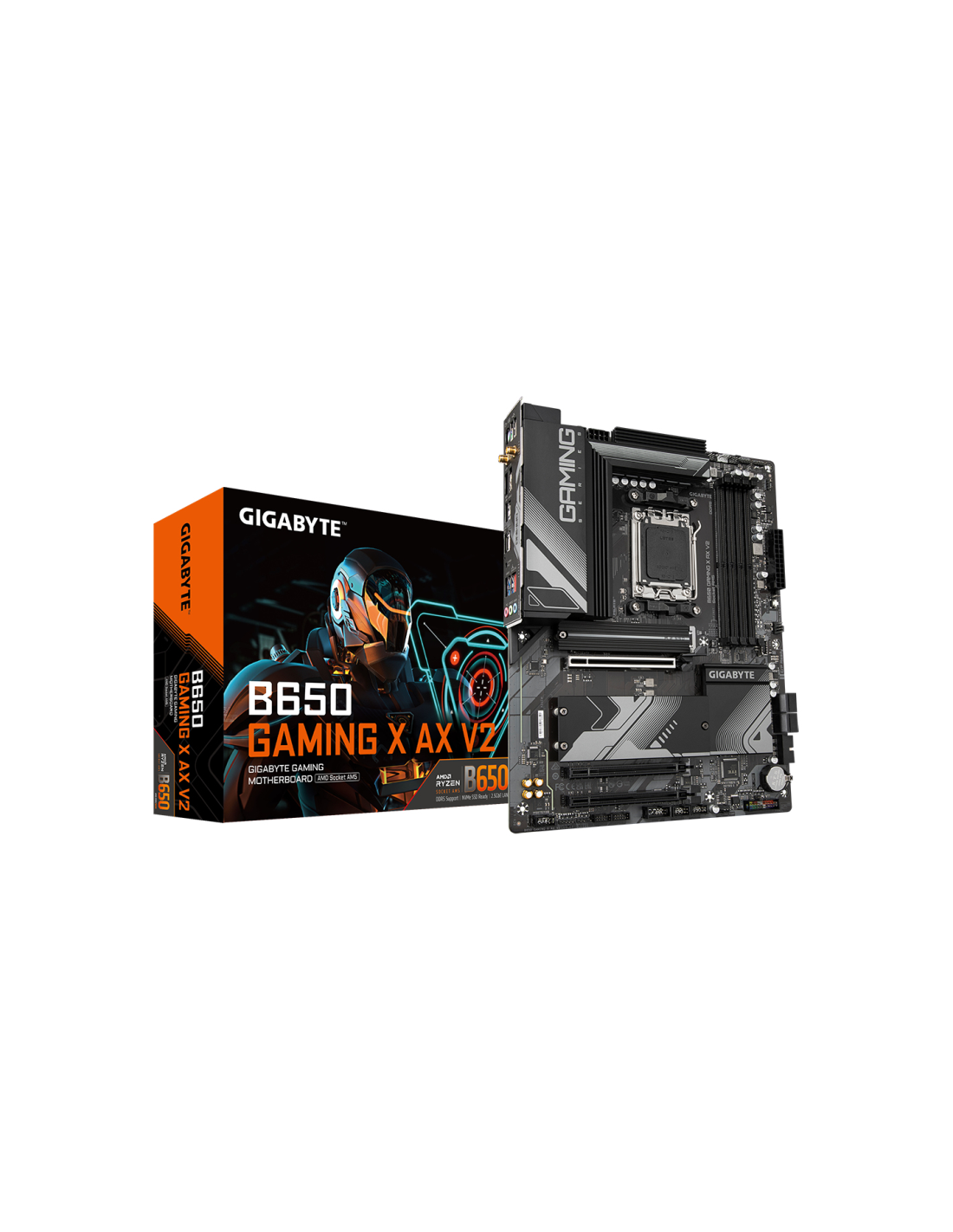 Gigabyte B650 GAMING X AX V2. Fabricante de procesador: AMD, Socket de procesador: Zócalo AM5, Procesador compatible: AMD Ryzen? 5, AMD Ryzen 7 7th Gen, AMD Ryzen 9 7th Gen. tipos de memoria compatibles: DDR5-SDRAM, Memoria interna máxima: 192 GB, Tipo de ranuras de memoria: DIMM. Interfaces de disco de almacenamiento soportados: M.2, PCI Express 4.0, SATA III, Tipos de unidades de almacenamiento admitidas: HDD & SSD, Niveles RAID: 0, 1, 10. Máxima resolución: 4096 x 2160 Pixeles. Conector USB: USB tipo A, USB Tipo C