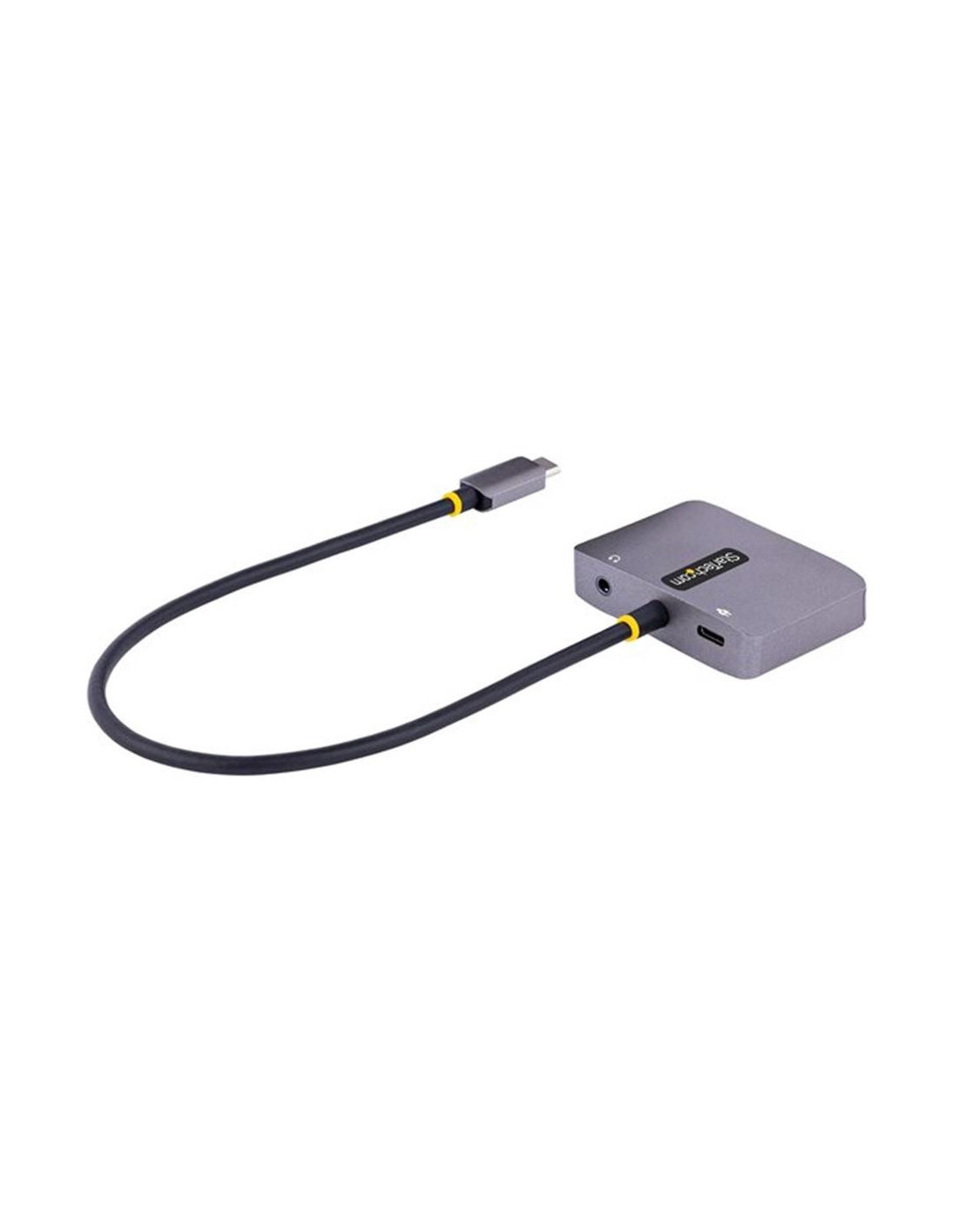 El **adaptador USB C a HDMI/VGA de StarTech.com** es una solución de conectividad compacta y potente, diseñada para ampliar las opciones de visualización de tu laptop o dispositivo compatible. Con soporte para resoluciones de hasta **4K a 60 Hz**, este adaptador te permite conectar tu dispositivo a pantallas externas mediante **HDMI** o **VGA**, y disfrutar de un sonido de alta calidad a través de su **salida de audio de 3.5 mm**. Además, incluye **USB-C Power Delivery 3.0**, permitiéndote cargar tu dispositivo mientras usas el adaptador, todo sin necesidad de complicados cables adicionales.### Conexión versátil y alta resoluciónEste adaptador multiport tiene múltiples salidas, permitiéndote conectar tu dispositivo a **pantallas HDMI** o **VGA**, ideal para diferentes tipos de monitores y proyectores. Soporta **resoluciones de hasta 3840 x 2160 a 60 Hz** a través de HDMI, mientras que la salida VGA alcanza resoluciones de hasta **1920 x 1200 a 60 Hz**. Además, es compatible con **HDR**, ofreciendo una experiencia visual de mayor calidad con colores más vibrantes y detalles más nítidos.- Resolución máxima HDMI: 3840 x 2160 a 60 Hz - Resolución máxima VGA: 1920 x 1200 a 60 Hz - Compatible con **HDR** para colores vibrantes y detalles nítidos### Alimentación y carga mediante USB-C Power Delivery 3.0El **USB-C Power Delivery 3.0** integrado permite una carga eficiente de hasta **100 W**, lo que te proporciona una **alimentación continua** para tu dispositivo mientras lo conectas a una pantalla externa. De este modo, no tienes que preocuparte por desconectar el adaptador para cargar tu laptop u otro dispositivo, facilitando el trabajo en entornos donde la movilidad es clave.- Suministro de energía de **100 W** (paso a través) - Compatible con **USB Power Delivery 3.0** - Carga mientras usas el adaptador sin interrupciones### Conectividad de audio y facilidad de usoGracias a su **salida de audio de 3.5 mm**, este adaptador también te permite conectar altavoces o auriculares, brindándote una solución todo-en-uno para multimedia. El diseño **Plug and Play** hace que la instalación sea rápida y sencilla, sin necesidad de controladores adicionales. Simplemente conéctalo a tu dispositivo compatible y comienza a disfrutar de tu configuración de pantalla extendida.- Salida de audio **mini-phone estéreo de 3.5 mm** - **Plug and Play**: No requiere instalación de controladores - Cable USB-C integrado de **30 cm** para fácil conexión ---