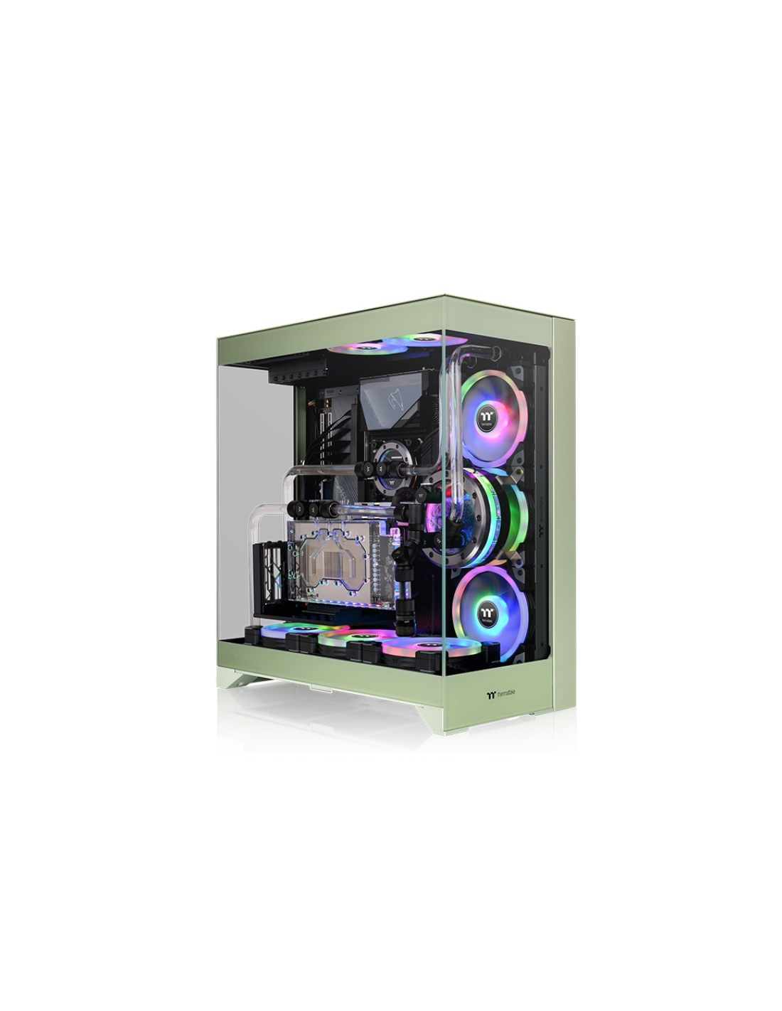 El chasis **CTE E550 TG Matcha Green** de Thermaltake es una torre intermedia con diseño de doble cámara y tres paneles de vidrio templado de 4 mm que ofrecen una **vista panorámica excepcional** de tus componentes. Está pensado para entusiastas que buscan un equilibrio entre estética, alto rendimiento térmico y compatibilidad con hardware moderno.