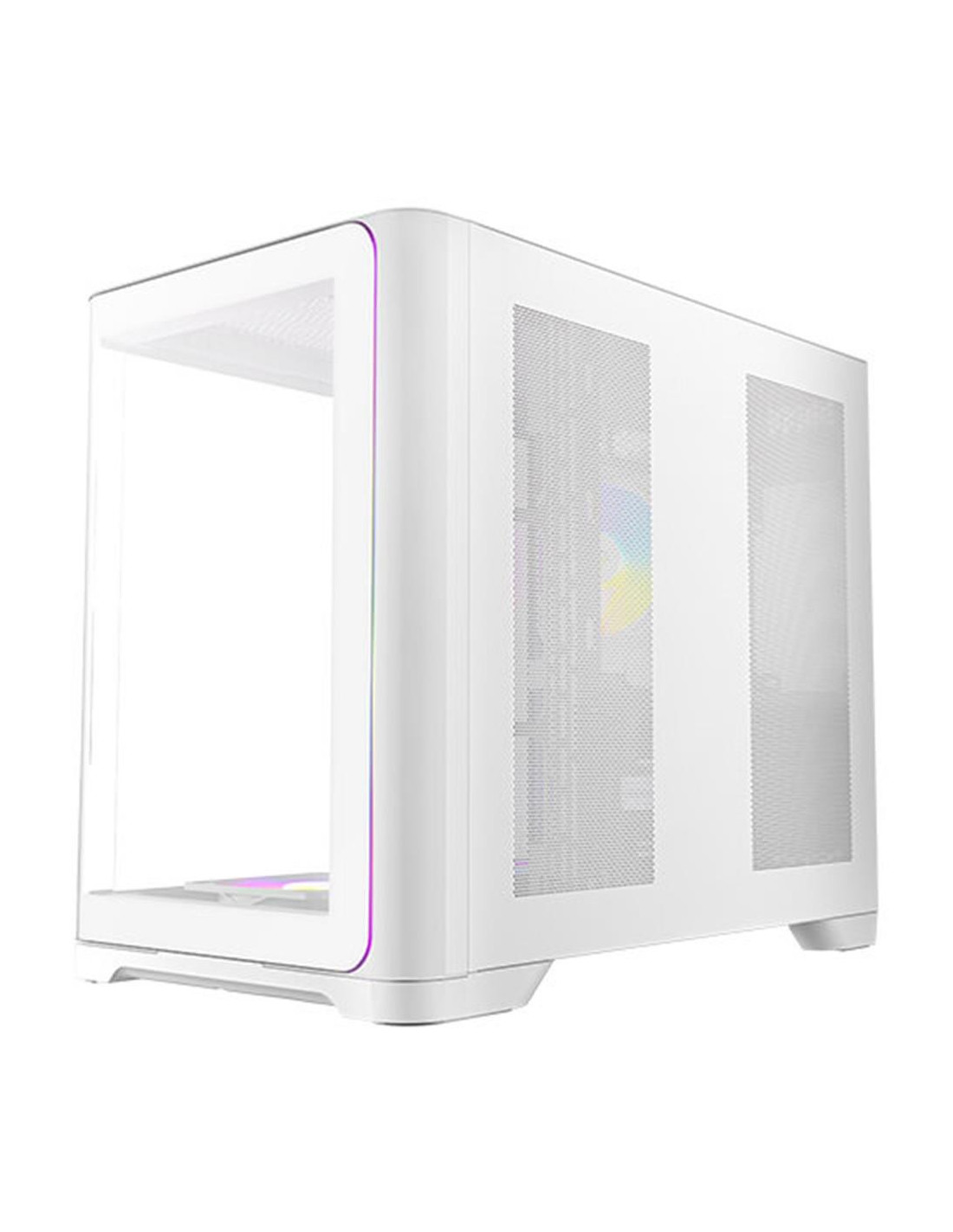 Equipada de serie con 4 ventiladores ARGB PWM (tres invertidos en la base y uno trasero), esta caja está lista para mantener bajas las temperaturas incluso en configuraciones exigentes. Su diseño permite un flujo de aire vertical, admitiendo múltiples combinaciones de ventiladores y radiadores para refrigeración líquida.