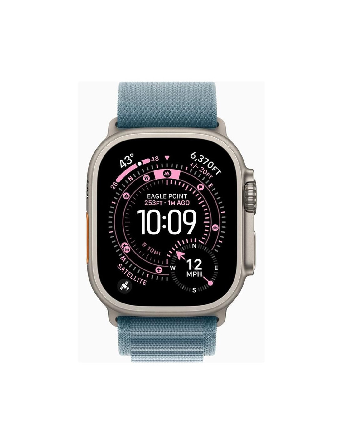 La correa Loop Alpine en azul claro está fabricada en tela resistente, con cierre de gancho en G, pensada para actividades extremas. Es de talla M, compatible con muñecas de entre 145 y 190 mm. La corona digital con retroalimentación háptica y los botones físicos ofrecen un control fácil incluso con guantes.
