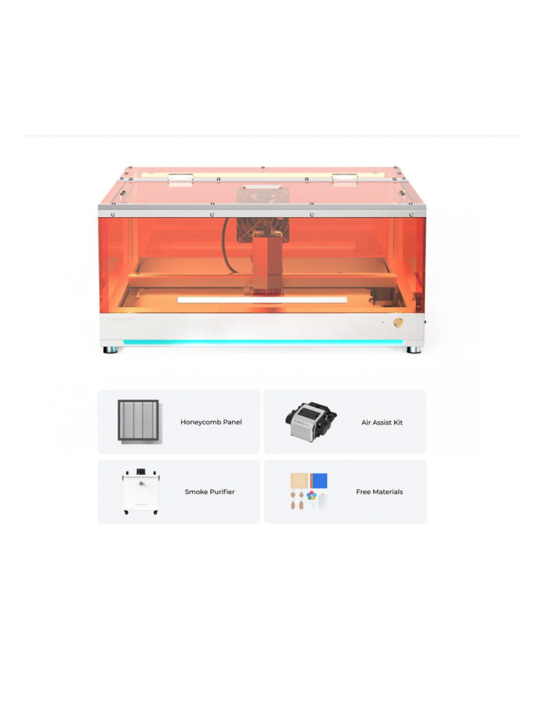 El pack incluye una serie de accesorios que optimizan tanto la eficiencia de trabajo como la seguridad ambiental. Con el asistente de aire se consigue una mayor limpieza en los cortes, reduciendo residuos y quemaduras. El purificador de aire filtra las emisiones generadas durante el grabado, creando un espacio más saludable. Y la placa de trabajo de nido de abeja mejora la ventilación bajo las piezas, favoreciendo cortes más precisos.