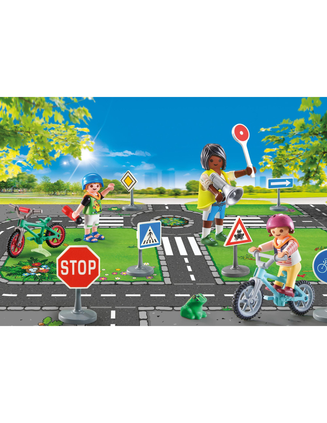 Comportarse correctamente en el tráfico es muy importante para niños/as y para adultos. Para ir al colegio y volver a casa sanos y salvos, los niños y niñas practican todas las normas importantes en Educación Vial. ¿Cuándo puedo cruzar la calle? Con el set de juego Educación Vial PLAYMOBIL, ¡la educación vial es divertida! El detallado juego introduce a niños y niñas en el tema del tráfico y les anima a recrear las normas en casa y reforzar lo que han aprendido.El set de juguetes incluye tres figuras PLAYMOBIL, seis señales de tráfico, dos bicicletas, un megáfono, una señal de mano y otros fantásticos extras. Un regalo ideal para el comienzo del colegio o a partir de 4 años.