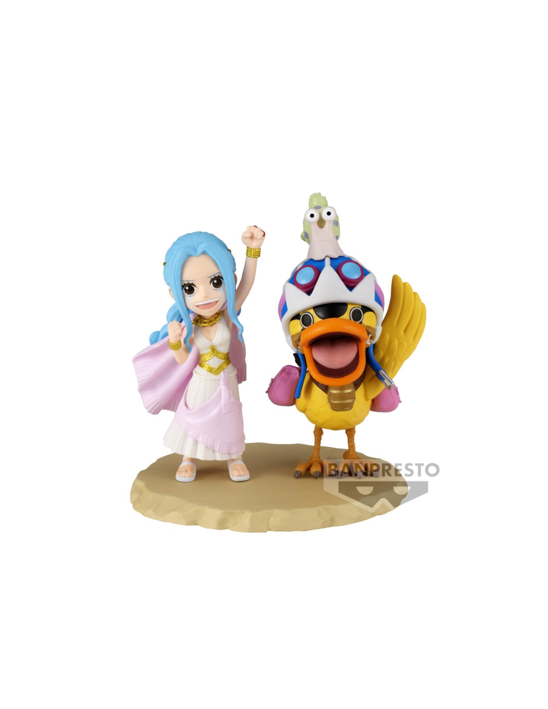 Banpresto presenta la figura de Nefeltari Vivi & Karoo del popular manga y anime One Piece World Collectable Log Stories. Esta figura está hecha en PVC mide unos 7 cm de alto e incluye una base