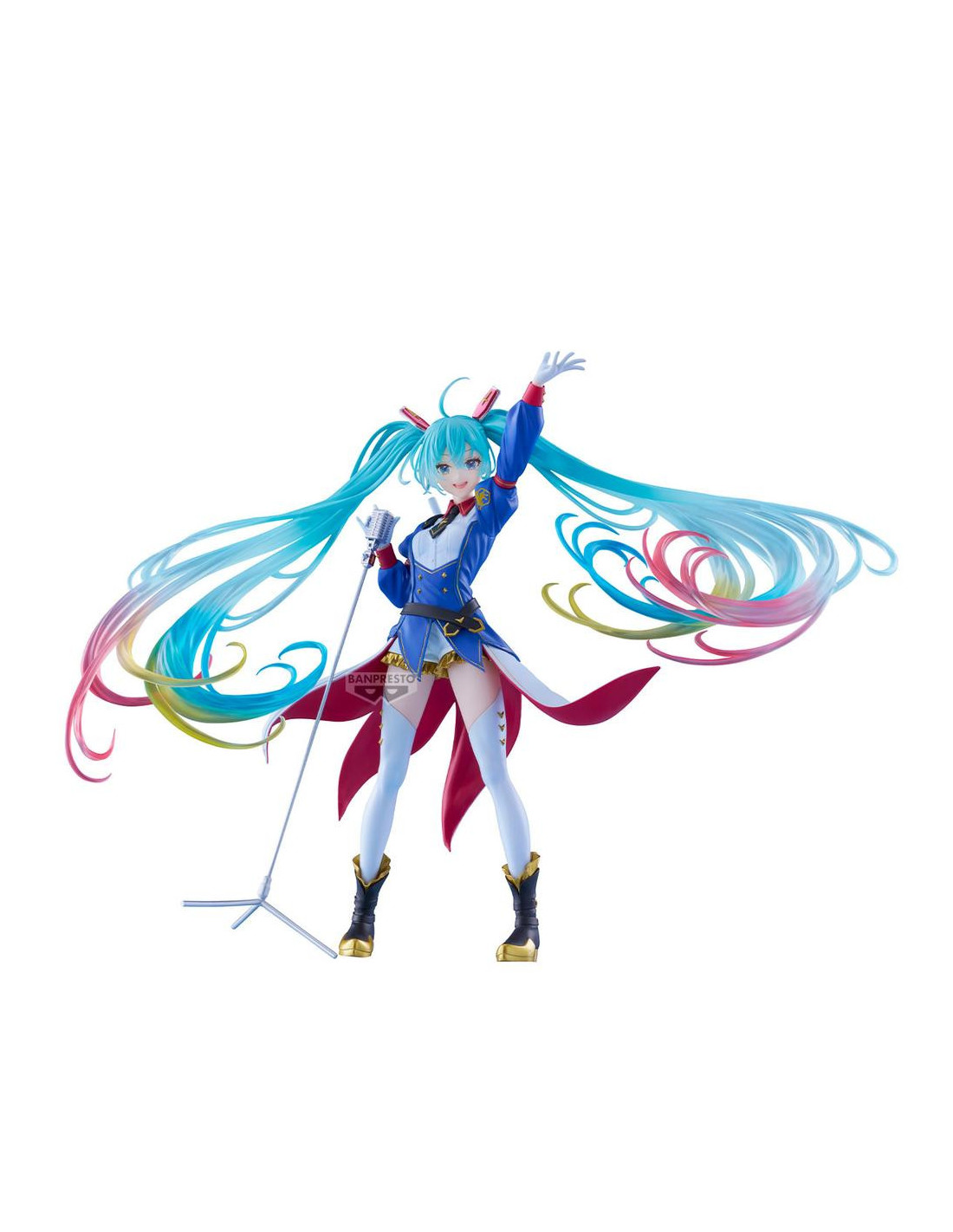 Figura de edición especial que celebra la colaboración entre Gundam (45.º aniversario) y Hatsune Miku. Presenta a Miku con un atuendo inspirado en el universo Gundam, fusionando elementos icónicos de ambos mundos como el traje tipo piloto, detalles mecánicos y una paleta de colores que mezcla el estilo futurista de los Mobile Suits con la estética vocaloid.