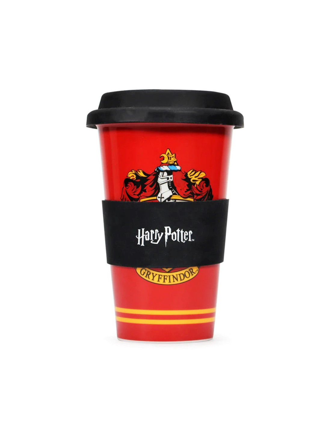 Una taza de viaje de cerámica roja decorada con el escudo de Gryffindor, perfecta