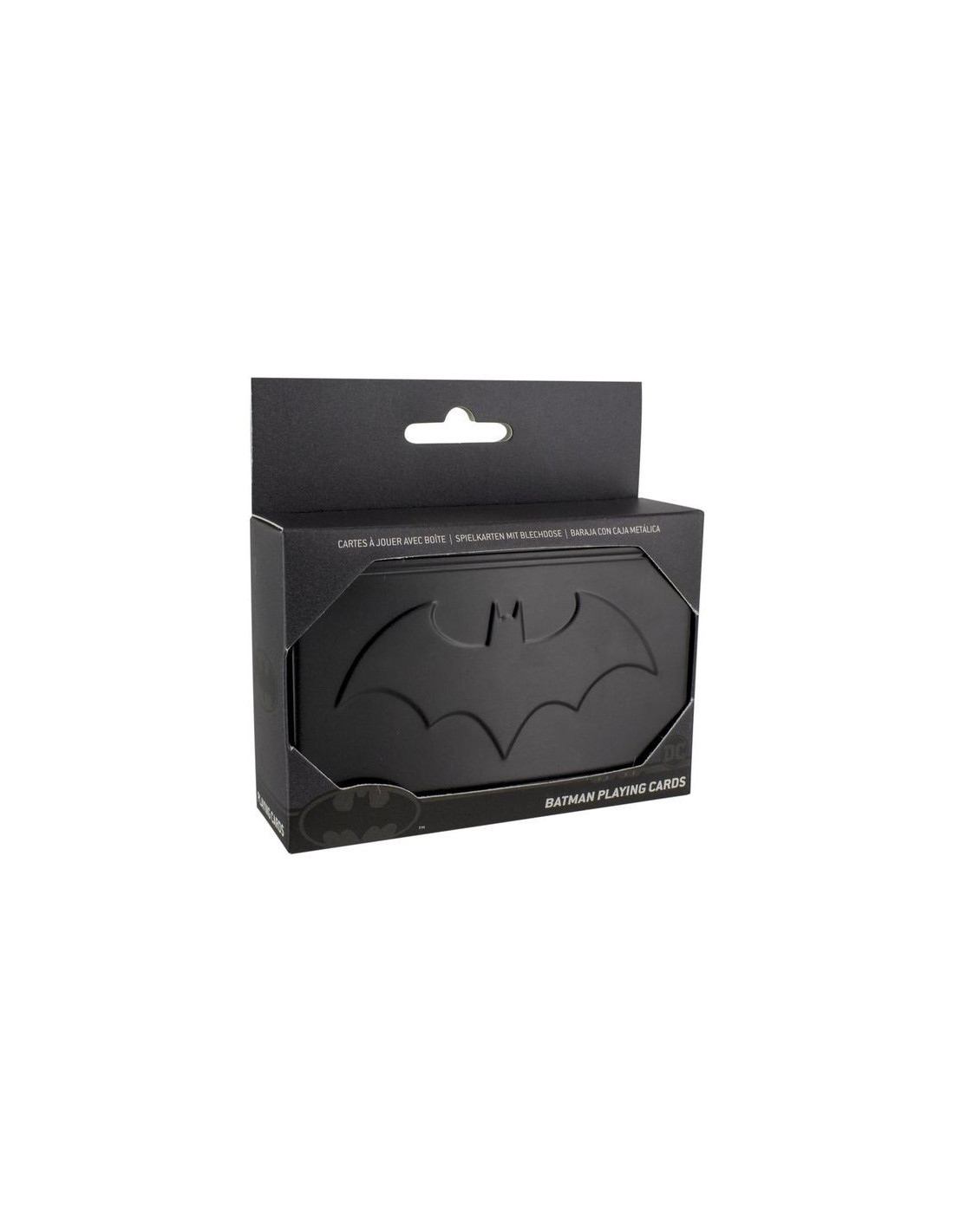 La baraja se presenta en una resistente caja metálica con relieve del emblemático logotipo de Batman. Además de aportar un aspecto elegante, esta caja protege las cartas frente al desgaste y facilita su transporte o almacenamiento.