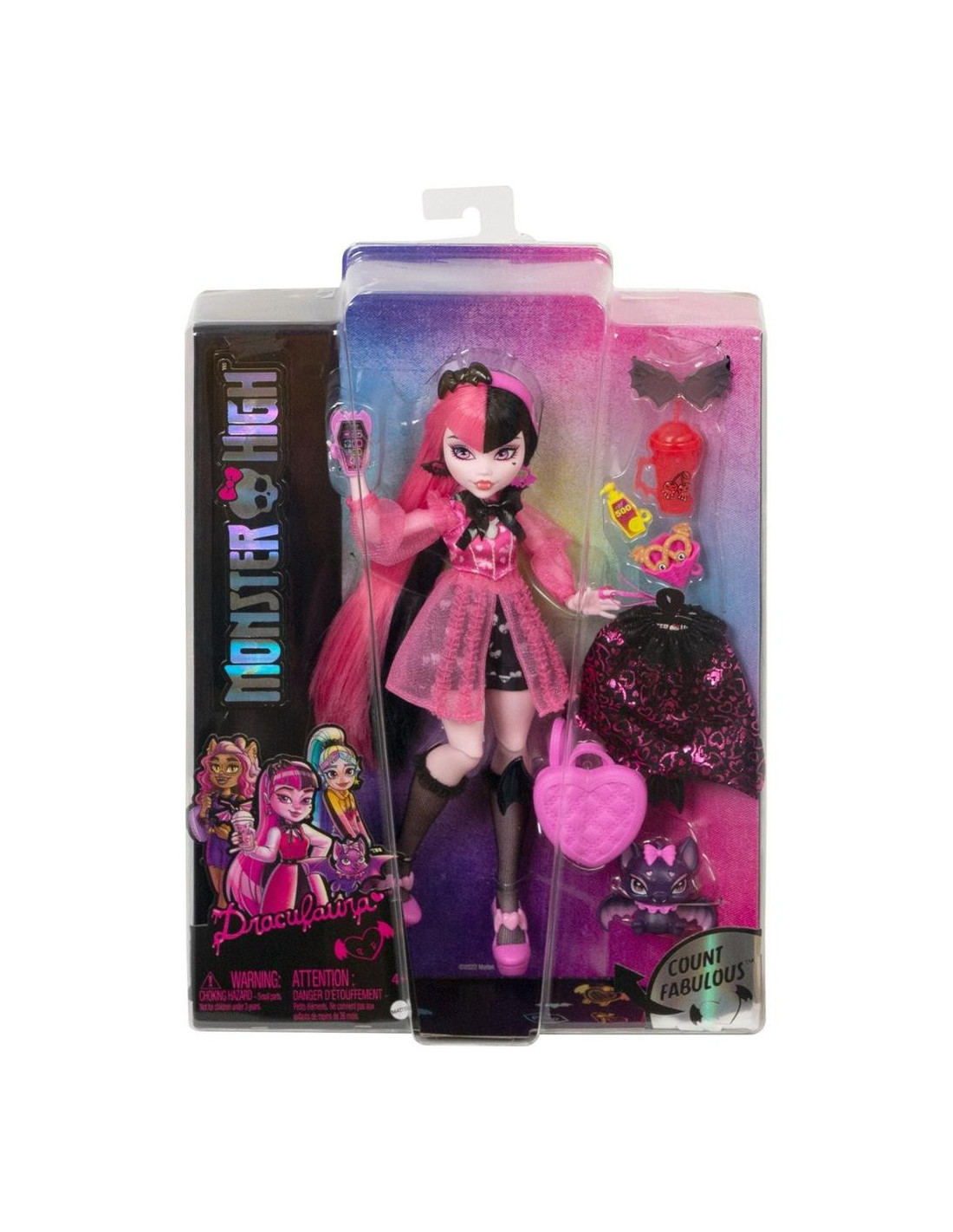 Incluye a la muñeca Draculaura de Monster High con un conjunto a la moda, zapatos y accesorios, con 1 capa, 1 figura de mascota, 1 mochila, 1 bebida, 1 pretzel, 1 bote de protección solar y 1