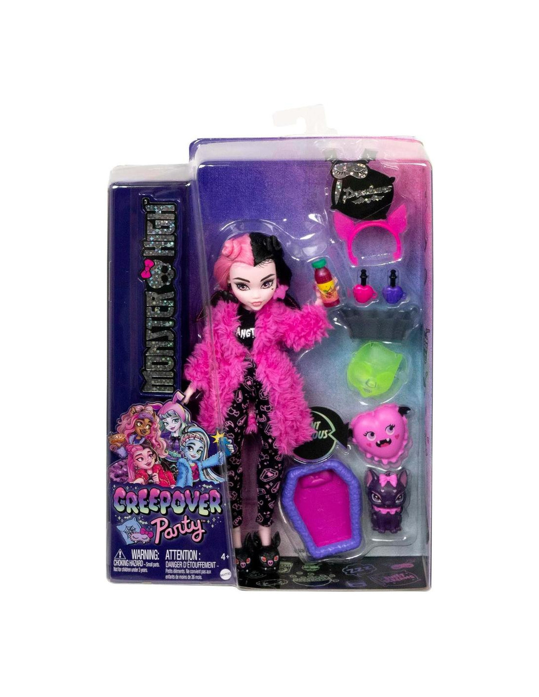 Incluye: 1 muñeca Draculaura con larga melena de color negra y rosa, pijama con cmaiseta negra, pantalón negro con detalles rosas, batín rosa y calzado negro con forma de murciélago, 1 mascota
