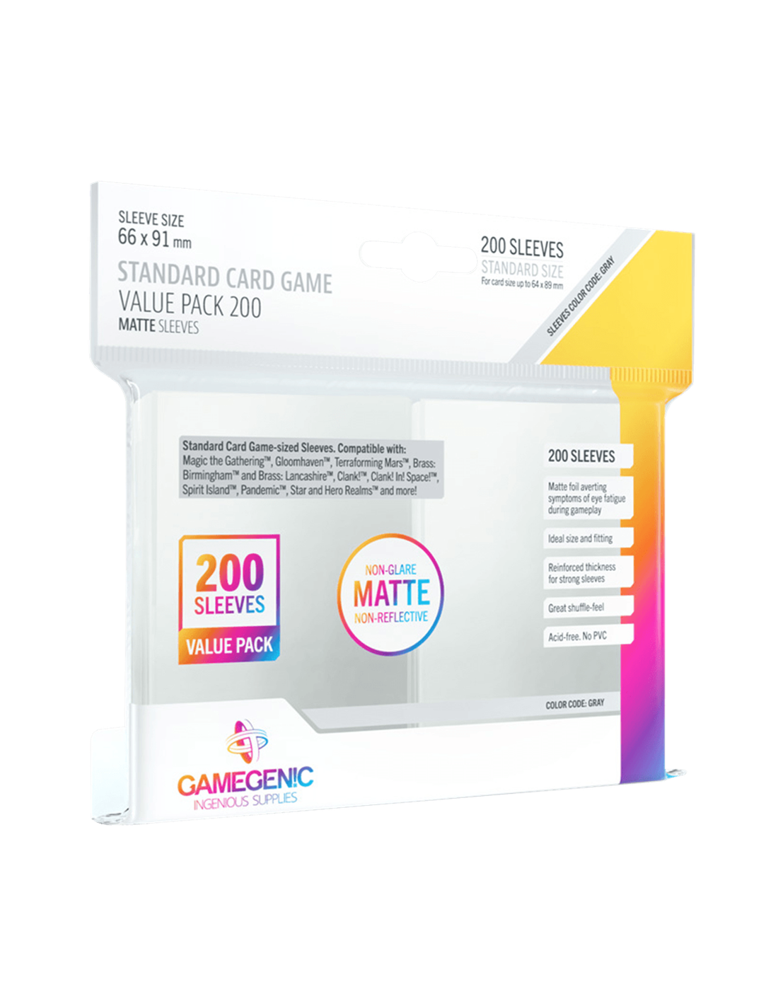 El Standard Card Game Value Pack contiene 200 fundas de tamaño estándar, ideales para proteger mazos grandes de cartas o componentes de juegos de mesa.