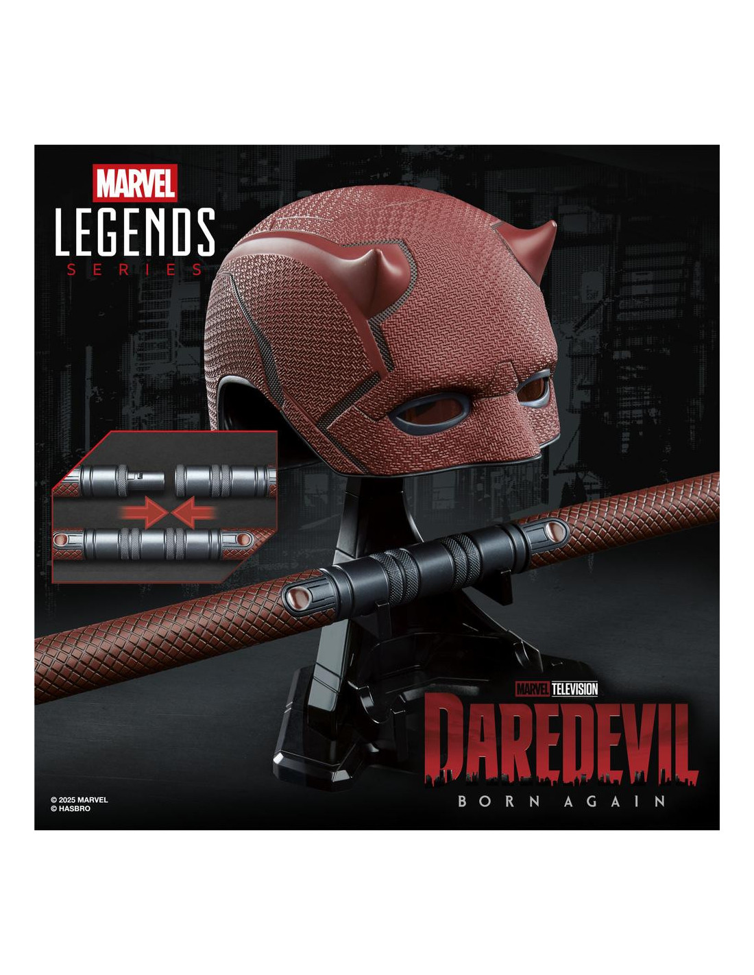 Este set no solo incluye la máscara, sino también un **bastón de combate de dos piezas**, para que puedas recrear escenas de acción o complementar tu atuendo de Daredevil. Además, se incluye una **base expositora** que permite lucir la pieza en cualquier colección de forma elegante y estable.