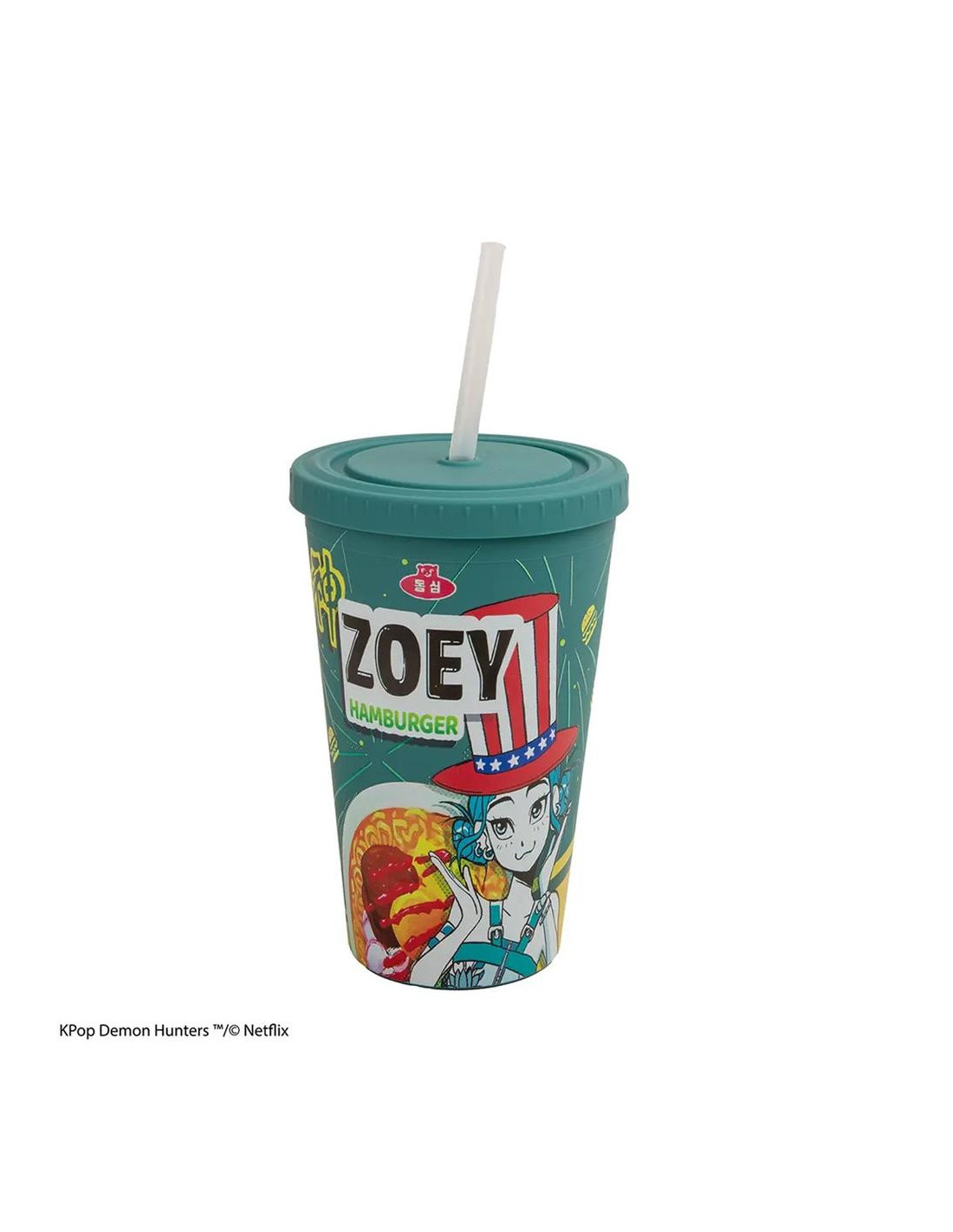 El tumbler presenta una ilustración colorida y llena de detalles inspirada en Zoey, uno de los personajes de KPop Demon Hunters. Su estética mezcla elementos de comida rápida y cultura urbana con una paleta pop que lo convierte en un artículo de colección.