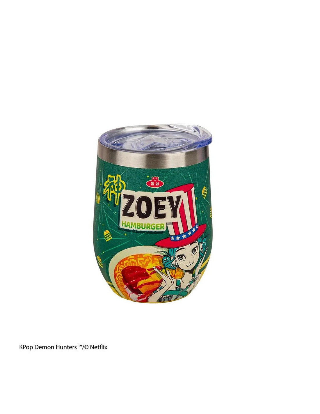 Esta taza de viaje presenta una ilustración de Zoey Hamburger, personaje de la serie "KPOP Demon Hunters" de Netflix, con un acabado de colores vivos y detalles que simulan una etiqueta de información nutricional en la parte trasera, a modo de parodia visual. Una pieza de colección original y funcional.