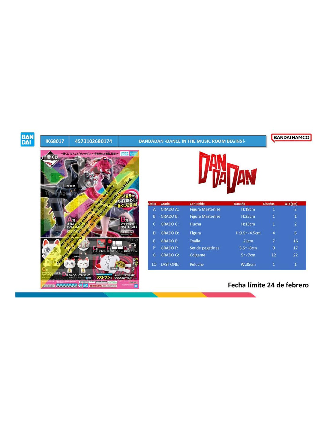 La Ichiban Kuji DANDADAN - Dance in the Music Room Begins! es una edición especial dirigida a coleccionistas y fans del manga y anime DANDADAN. Esta serie destaca por incluir figuras de gran detalle inspiradas en los protagonistas en sus formas espirituales, ofreciendo piezas exclusivas que elevan cualquier colección. Gracias a su formato limitado, se convierte en una oportunidad muy atractiva para quienes buscan premios de alto valor.