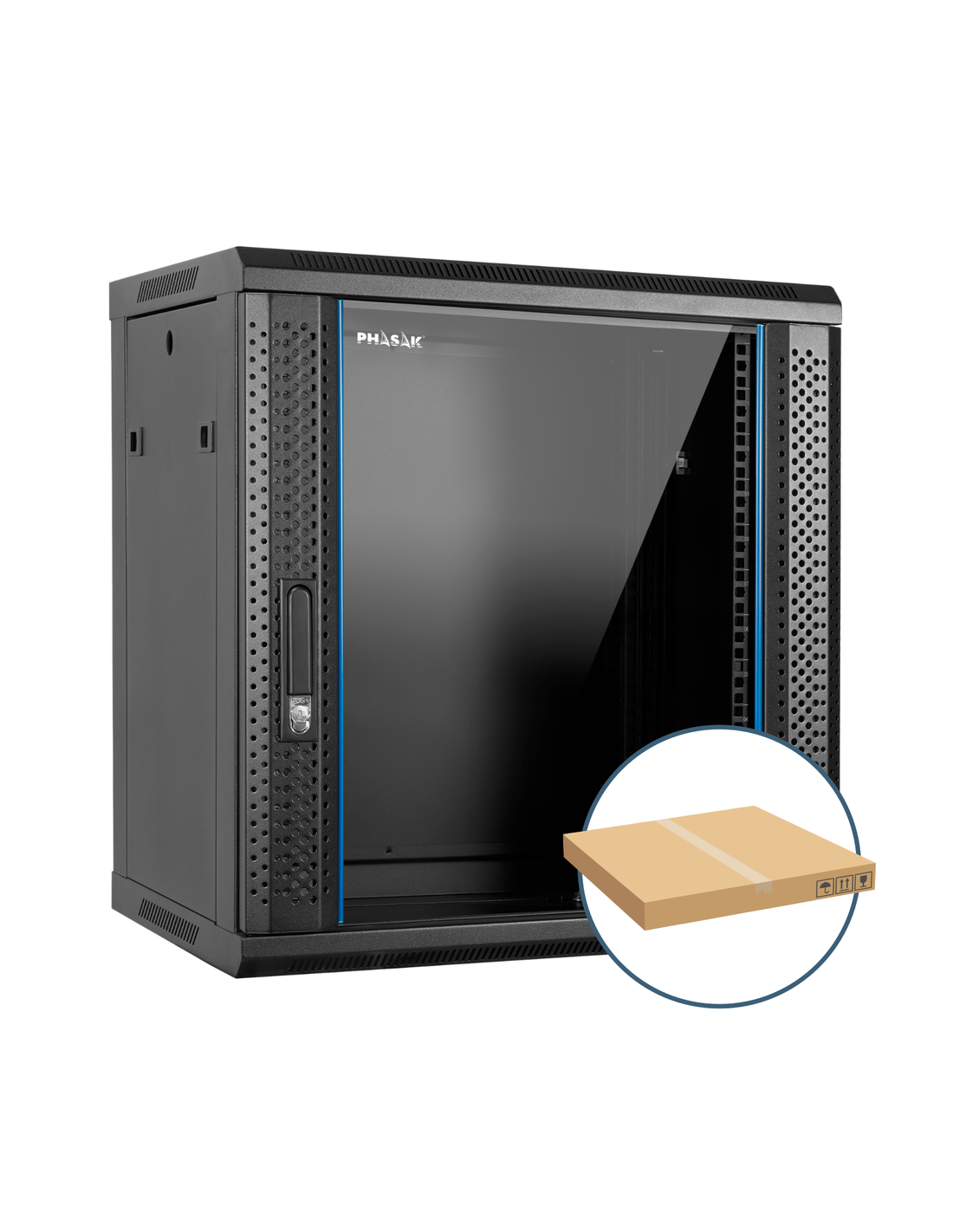 Este modelo es totalmente compatible con los accesorios PHASAK 19" como bandejas, regletas PDU u organizadores de cableado, permitiendo una configuración personalizada según las necesidades del proyecto.