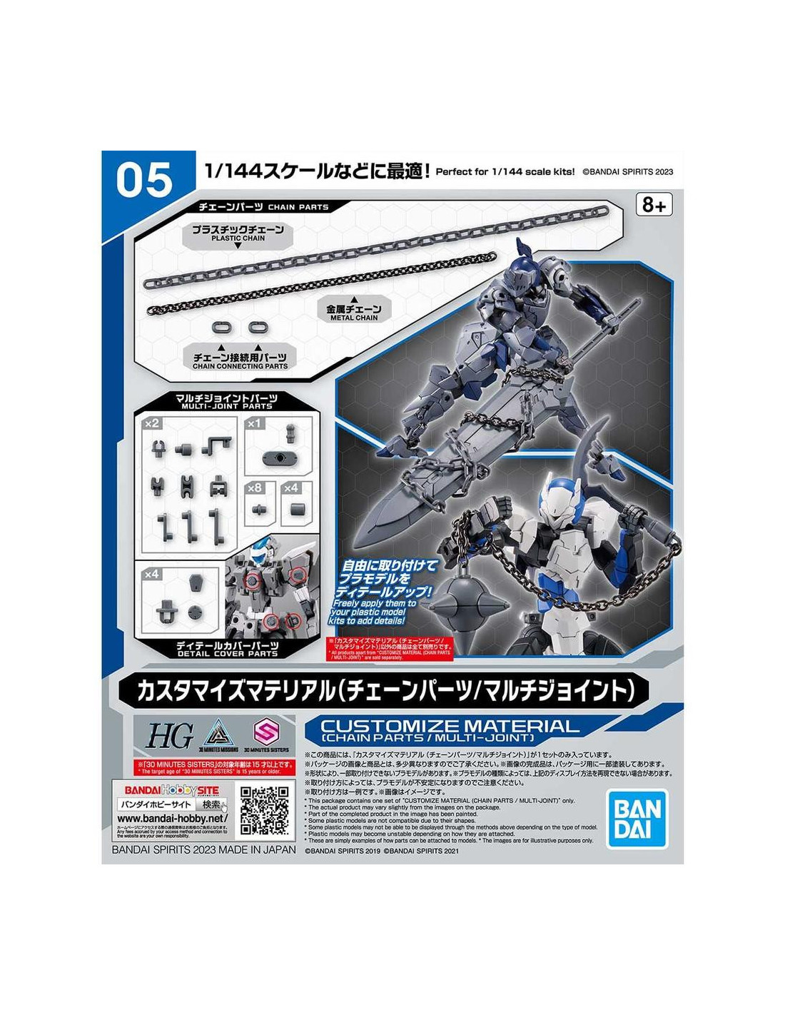 El CUSTOMIZE MATERIAL CHAIN PARTS de Gunpla es un set de piezas de personalización diseñado para ampliar las posibilidades creativas en tus modelos a escala. Fabricado por Bandai y compatible con la escala 1/144, este kit es ideal para aficionados al modelismo que buscan añadir detalles mecánicos y efectos dinámicos a sus construcciones de las series 30 Minutes Missions y 30 Minutes Sisters.