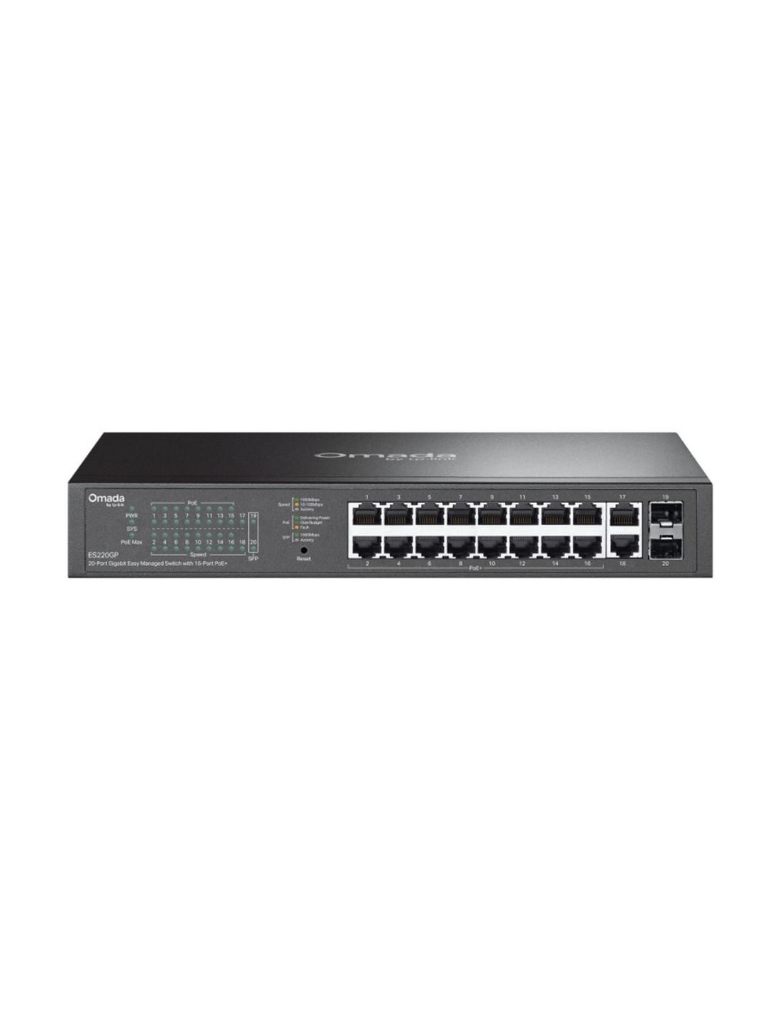 El Omada ES220GP es un switch gestionado Gigabit diseñado para redes profesionales que requieren alto rendimiento, control avanzado y alimentación PoE+. Gracias a sus 18 puertos RJ-45 Gigabit y 2 ranuras SFP, permite conectar numerosos dispositivos de red como puntos de acceso, cámaras IP o sistemas VoIP. Su administración basada en web y gestión en la nube mediante la plataforma Omada facilitan la supervisión y configuración de la red de forma centralizada.