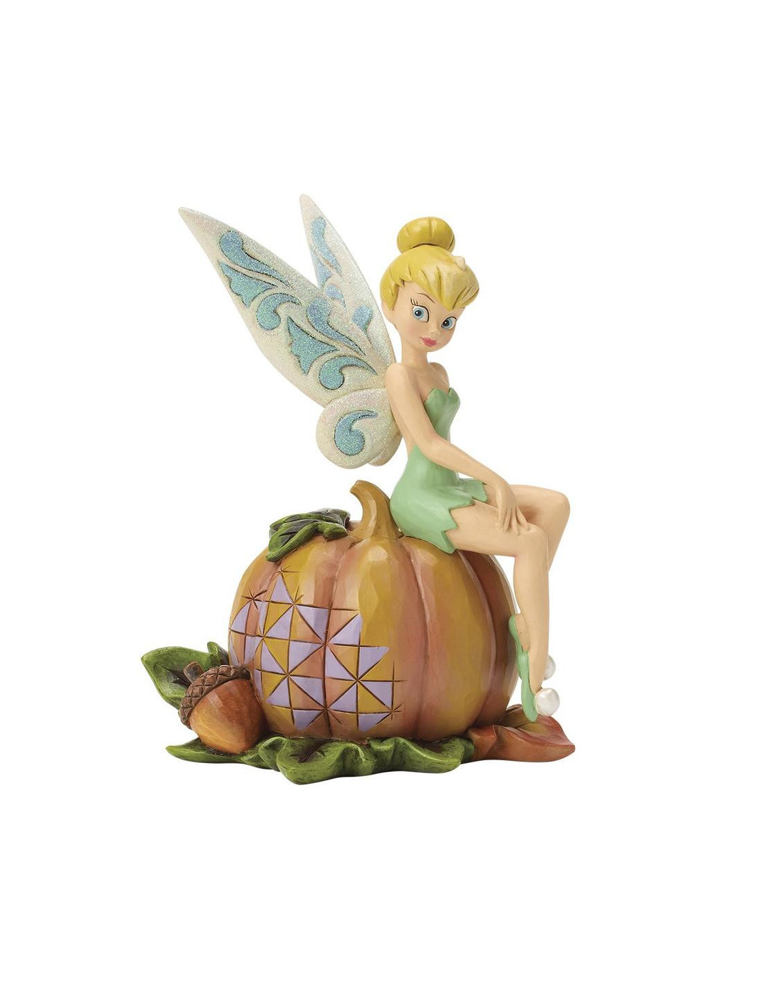 Cada figura está cuidadosamente esculpida y pintada, capturando la esencia del personaje de Campanilla con expresiones delicadas y alas brillantes. Los detalles de la calabaza y los elementos naturales, como hojas y bellotas, aportan un realismo encantador que hace que la pieza destaque como decoración o regalo.
