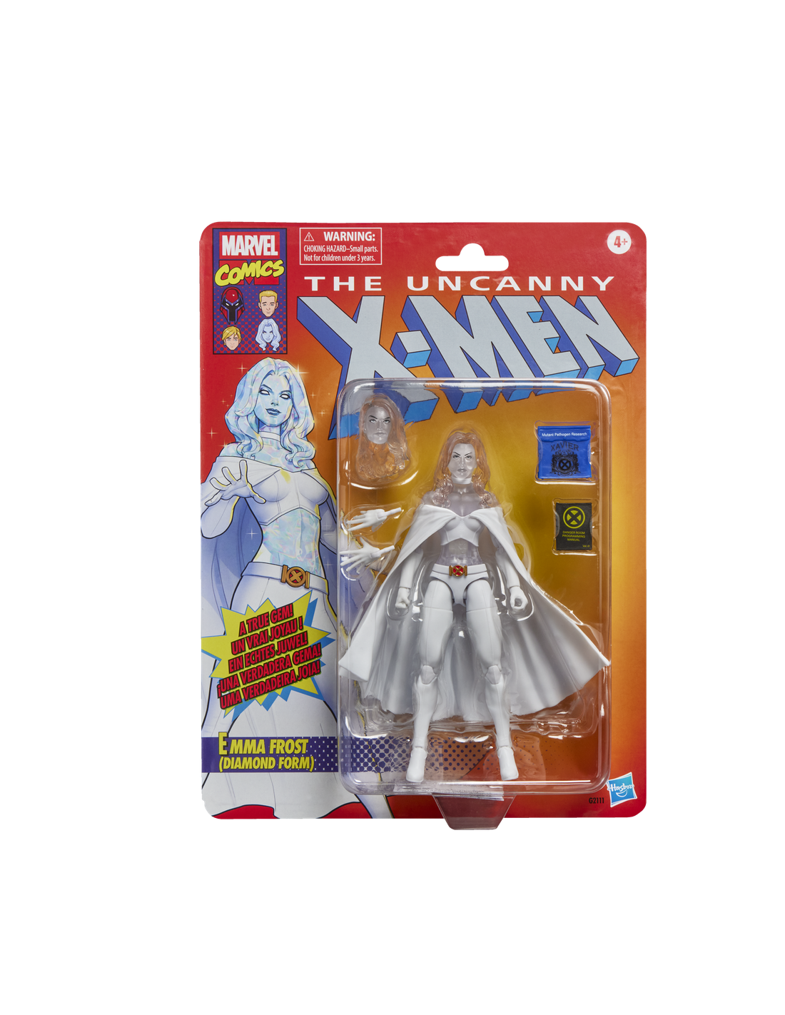 Esta figura está basada en la aparición de Emma Frost en la serie Astonishing X-Men, capturando su característico aspecto en forma de diamante. El diseño presenta acabados detallados y proporciones fieles al personaje, convirtiéndola en una pieza ideal para exhibir junto a otras figuras de la línea Marvel Legends.