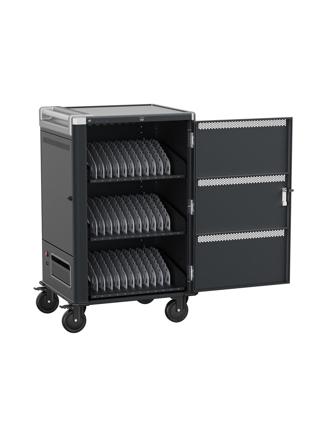 El carro de carga EW1701 le permite proteger, almacenar y cargar fácilmente hasta 36 dispositivos Tablets, Chromebook o portátiles con pantallas de hasta 15.6". Cuenta con un sistema de carga inteligente,