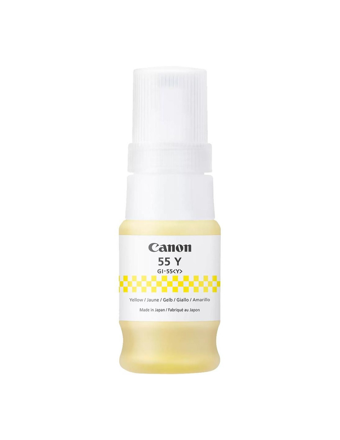 La botella de tinta amarilla GI-55Y de Canon contiene un pigmento nítido que permite producir documentos y fotos de calidad empresarial en casa y en el trabajo. Al combinarla con un conjunto completo de tintas