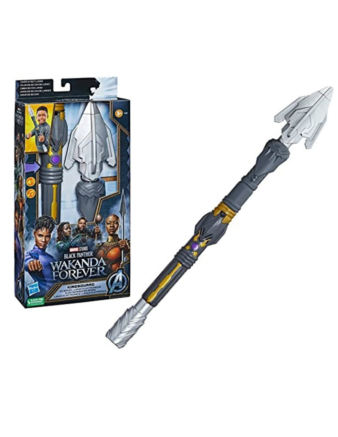 Con la lanza electrónica Black Panther: Wakanda Forever Kingsguard, de Marvel Studios, los niños a partir de 5 años podrán imaginar las mayores batallas. Los equipos para juego de rol de Black Panther: Wakanda Forever cuentan con diseños y detalles inspirados en la película. Juega a equiparte para la batalla y a defender a Wakanda de sus enemigos con música inspirada en la película y efectos activados por movimiento. Presiona el botón para activar la lanza electrónica Kingsguard y muévela para escuchar efectos de sonido. Mantén presionado el botón para escuchar música de la película y otros efectos de sonido.