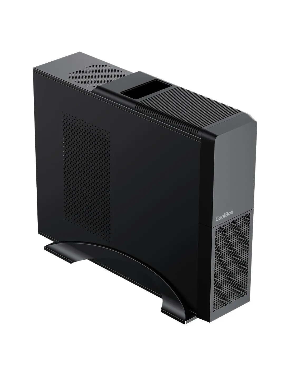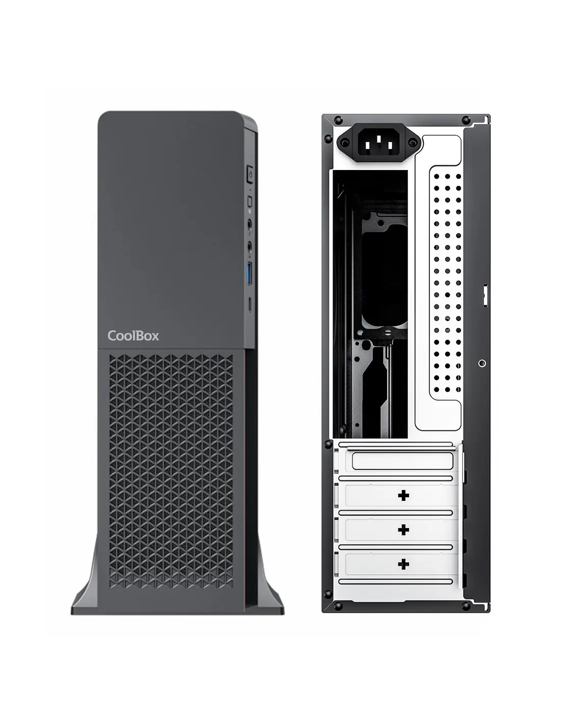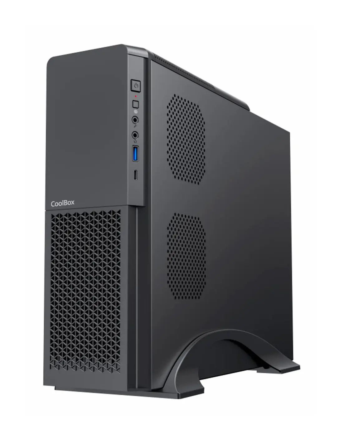 Este chasis puede venir equipado con una fuente CoolBox BASIC-500GR-S de 500W o 300SBZ SFX 80+ Bronze, ofreciendo eficiencia y fiabilidad para sistemas de gama básica o media. Además, incluye opciones de seguridad física como soporte para candado, cierre Kensington y botón de alarma (opcional), ideales para entornos corporativos.