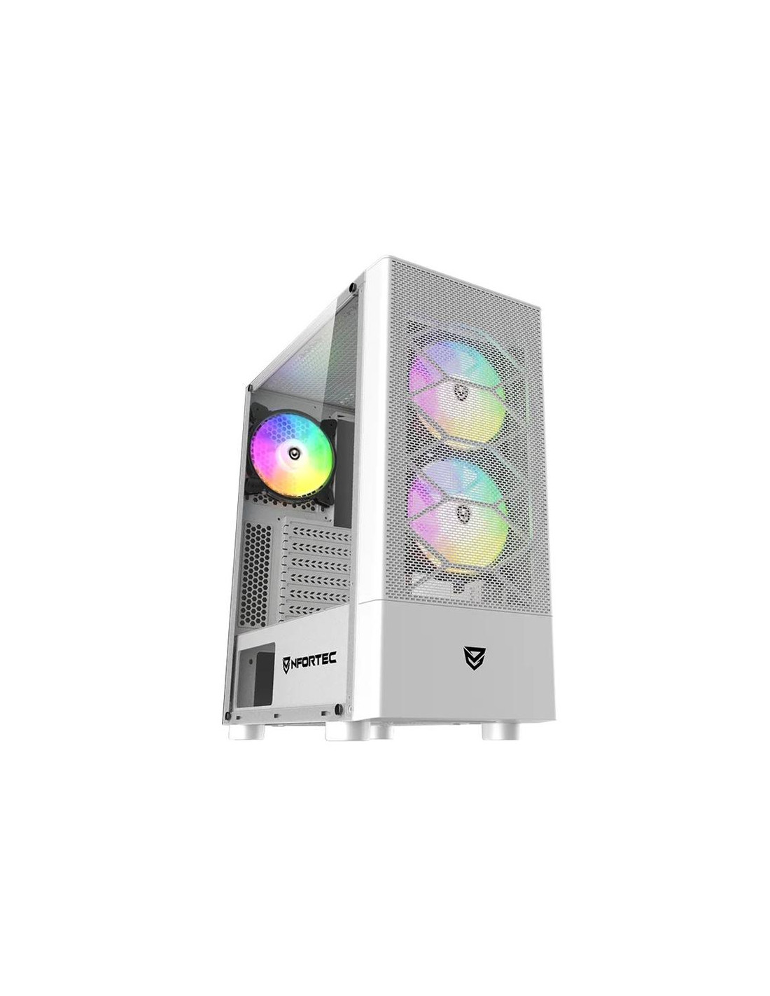 La Nfortec Caelum es una caja semitorre diseñada para los entusiastas del gaming que buscan un chasis con buena ventilación, diseño moderno y espacio para componentes de alto rendimiento. Con un panel lateral de cristal templado y ventiladores RGB incluidos, ofrece una excelente relación calidad-precio para montar un equipo atractivo y funcional.