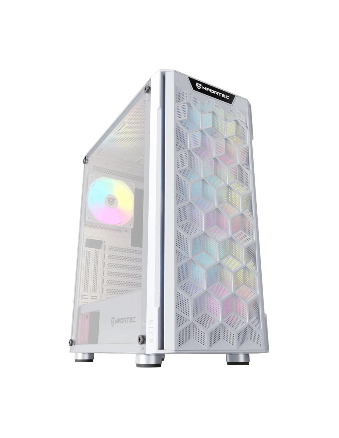 La Nfortec Azir en color blanco es una caja semitorre diseñada para montar equipos gaming o de alto rendimiento con una excelente relación entre flujo de aire, estética y espacio interior. Con un diseño elegante en blanco, panel lateral de cristal templado y ventiladores A-RGB incluidos, es ideal para quienes buscan una configuración llamativa sin renunciar a la ventilación ni a la compatibilidad con componentes exigentes.