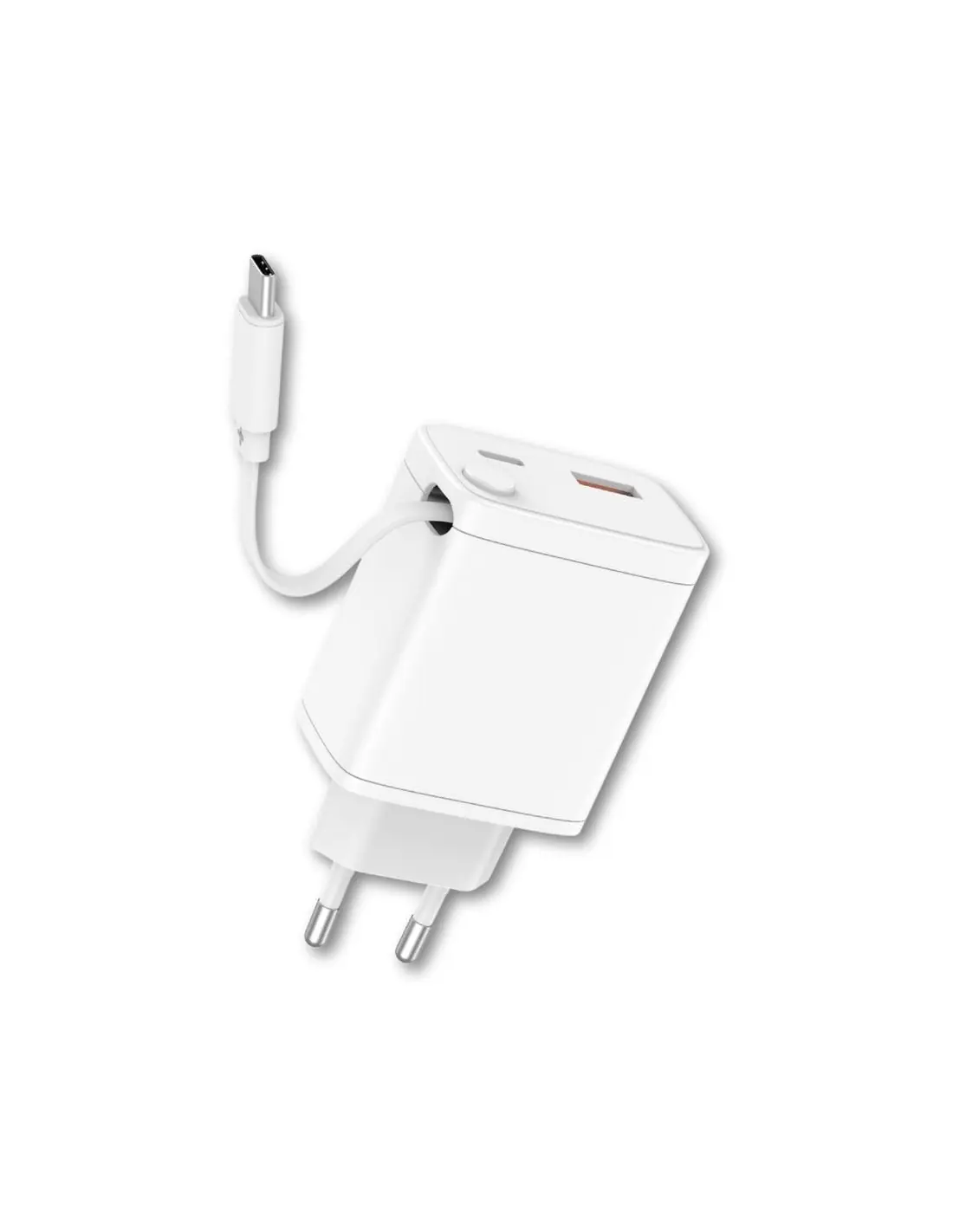 Cargador con doble salida USB y conector Tipo C, acompañado de un cable Tipo C. Diseñado con carcasa ignífuga para mayor seguridad. Incorpora chip de carga inteligente que optimiza la entrega de energía según el dispositivo conectado.