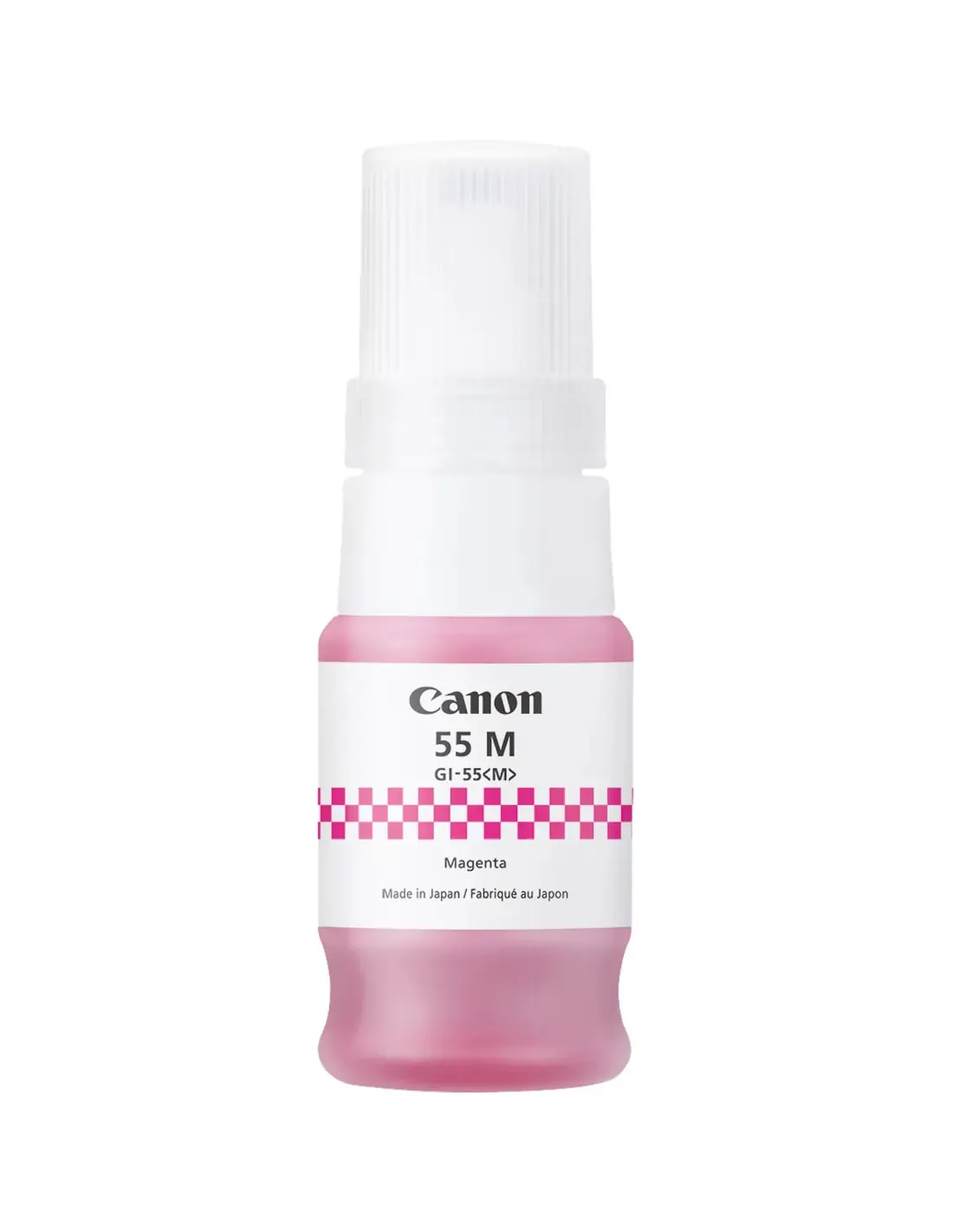 La botella de tinta magenta GI-55M de Canon contiene un pigmento nítido que permite producir documentos y fotos de calidad empresarial en casa y en el trabajo. Al combinarla con un conjunto completo de tintas