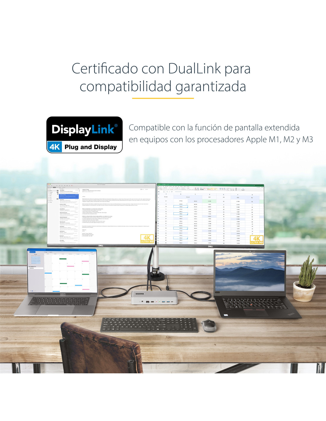 El Dock cuenta con la certificación DisplayLink, para compatibilidad Plug and Display con Windows, ChromeOS y macOS, lo que permite el funcionamiento y el cambio entre varios ordenadores con sistemas operativos diferentes. La tecnología DisplayLink también es compatible con dos pantallas ampliadas en los MacBook M1/M2 de Apple que no son capaces de manejar de forma nativa más de una pantalla externa. La certificación DisplayLink garantiza la compatibilidad con resoluciones de hasta 4K 60Hz en ambas pantallas externas.
