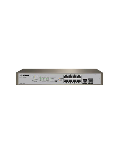 8 puertos Ethernet 10/100/1000 Base-T con PoE, 1 puerto Ethernet 10/100/1000 Base-T (datos) y 1 puerto SFP 1000 Base-X.