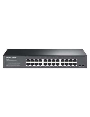 El **Mercusys MS124GS** es un switch no gestionable diseñado para entornos de red que requieren **alta velocidad, estabilidad y facilidad de uso**. Con sus **24 puertos Gigabit RJ45**, ofrece un rendimiento ideal para oficinas, pequeñas empresas y redes domésticas exigentes. Su diseño metálico y enrackable, junto con funciones avanzadas como **aislamiento de puertos** y **prevención de bucles**, lo convierten en una solución eficiente y duradera para distribuir el tráfico de red sin complicaciones.
